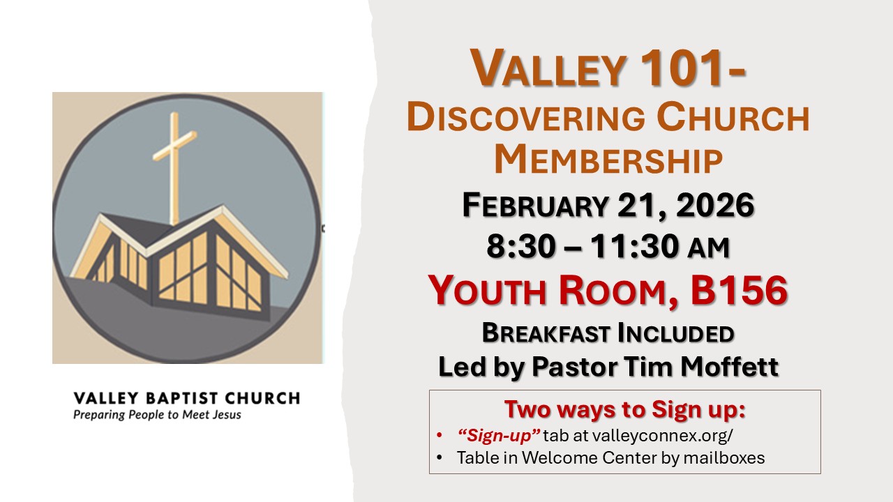 The expectation here at Valley is that everyone will serve in some way. The first step is to complete the Membership Class that is offered periodically. Then you may contact any staff or Ministry Council member to find an area in which to serve.